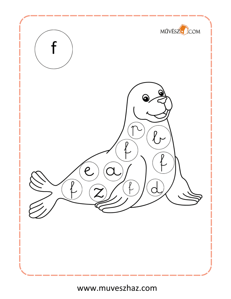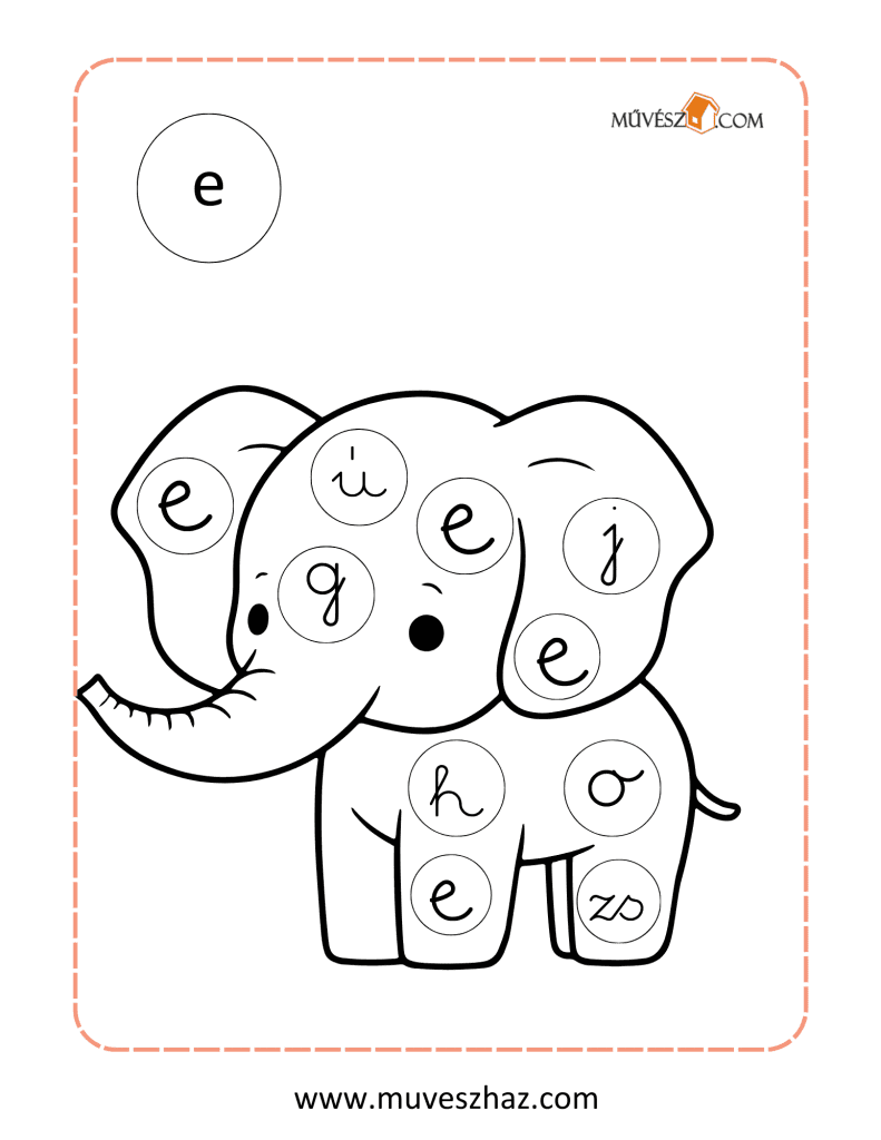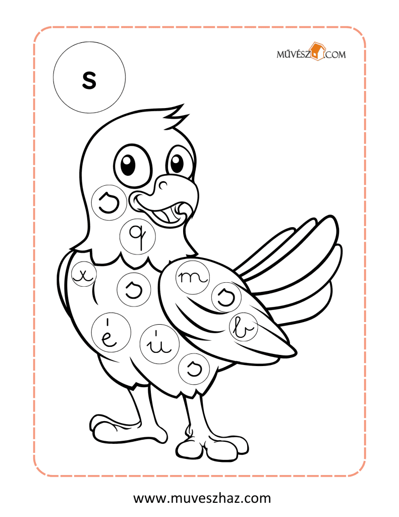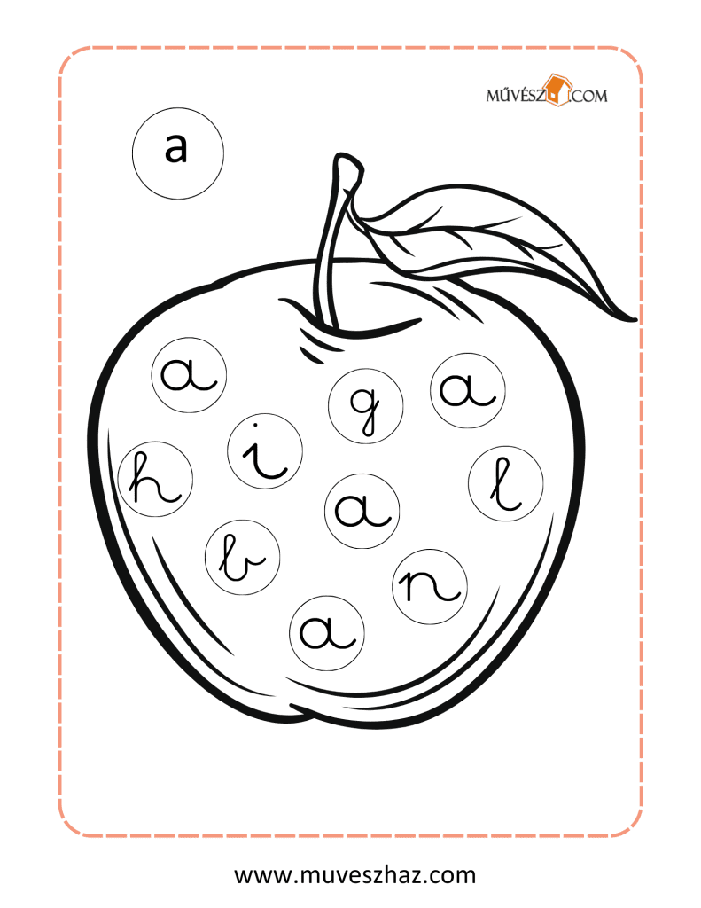 A lap bal felső sarkában látható az ABC egyik nyomtatott betűje, és a lap közepét egy olyan kép tölti ki, ami ezzel a betűvel kezdődik. A képen kis körökben különböző írott kisbetűk találhatók. Gyermeked feladata, hogy kiszínezze azokat a kis köröket, amelyekben a bal felső sarokban található nyomtatott betű írott alakja szerepel.