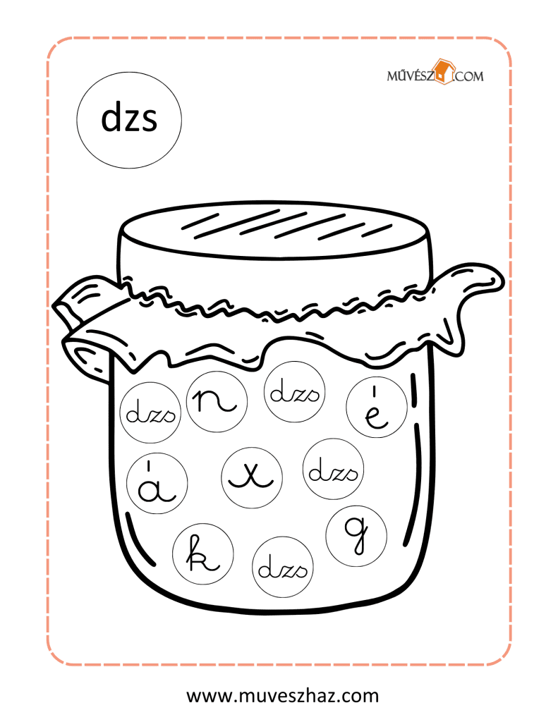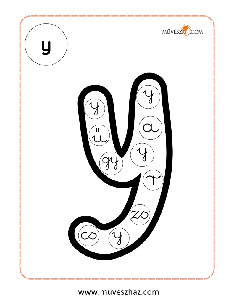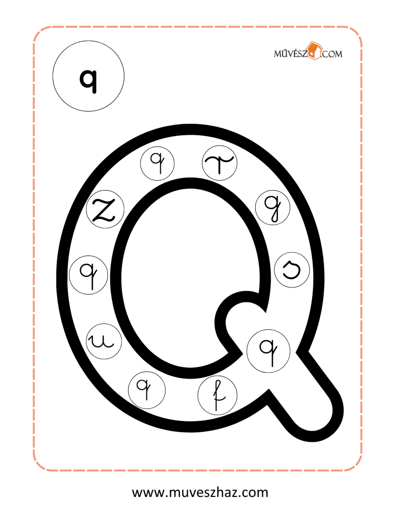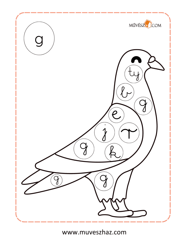 A lap bal felső sarkában látható az ABC egyik nyomtatott betűje, és a lap közepét egy olyan kép tölti ki, ami ezzel a betűvel kezdődik. A képen kis körökben különböző írott kisbetűk találhatók. Gyermeked feladata, hogy kiszínezze azokat a kis köröket, amelyekben a bal felső sarokban található nyomtatott betű írott alakja szerepel.
