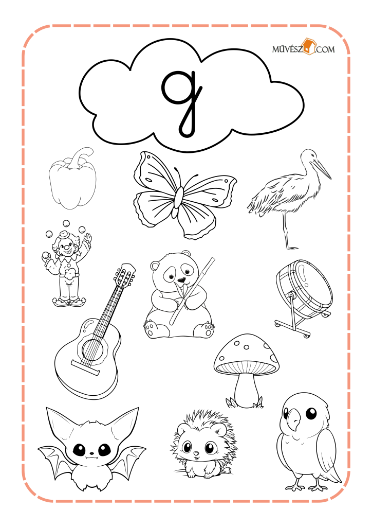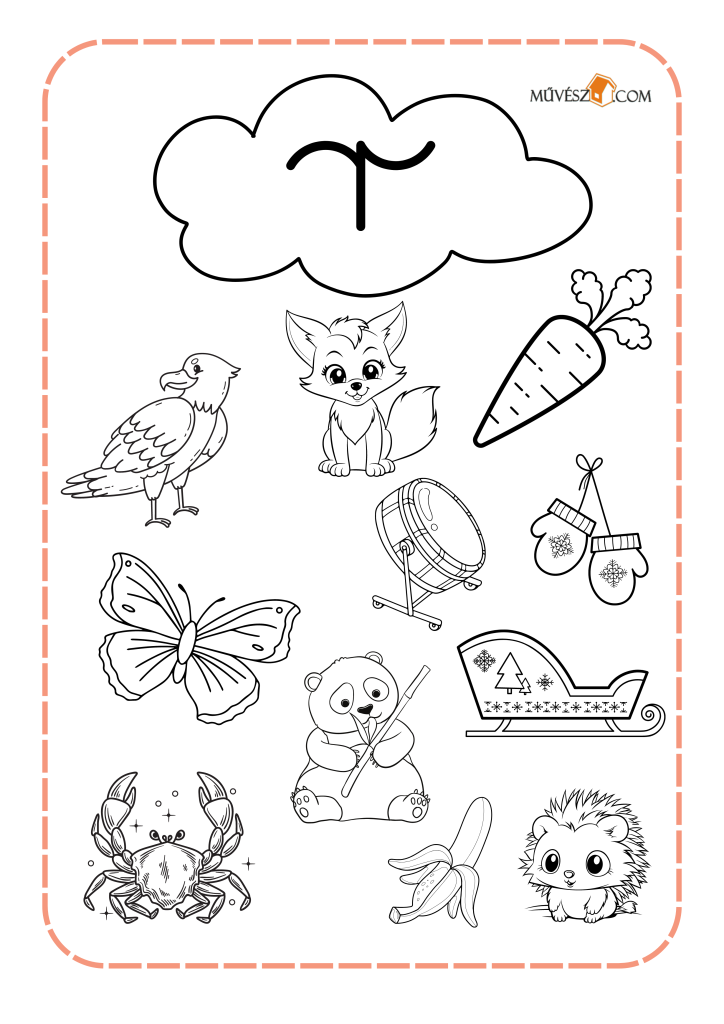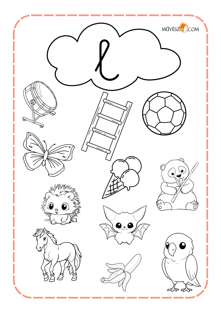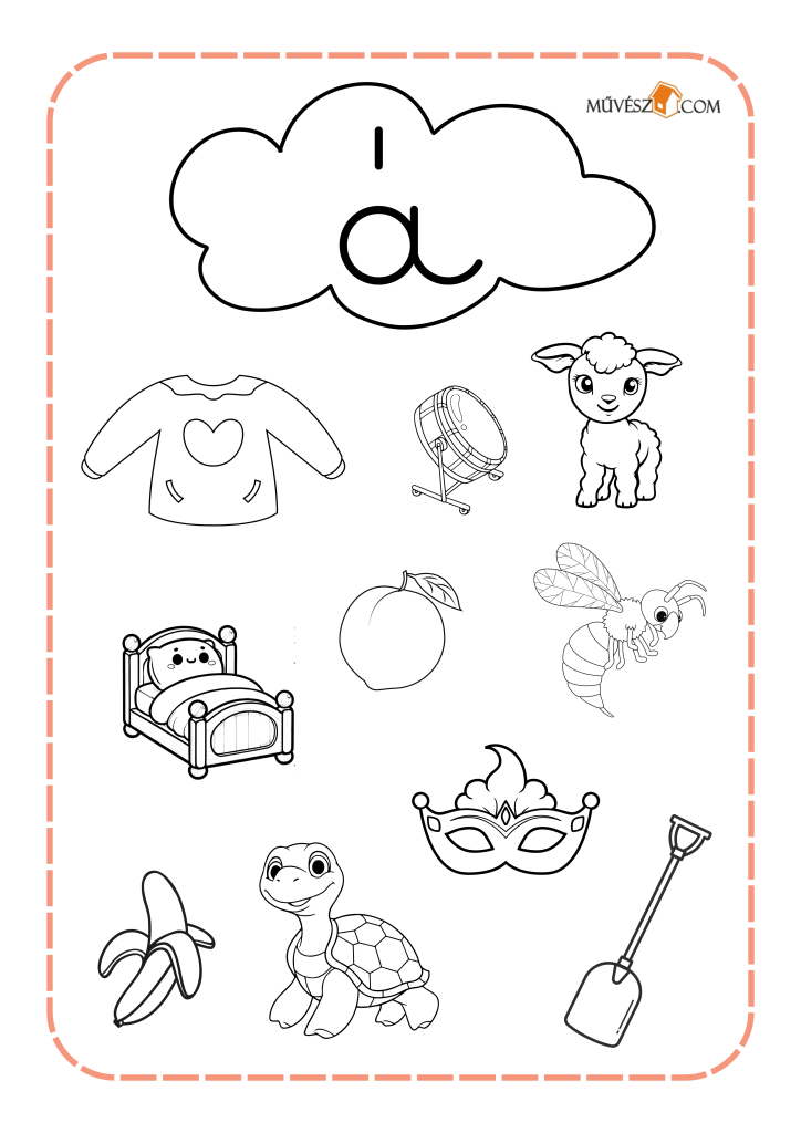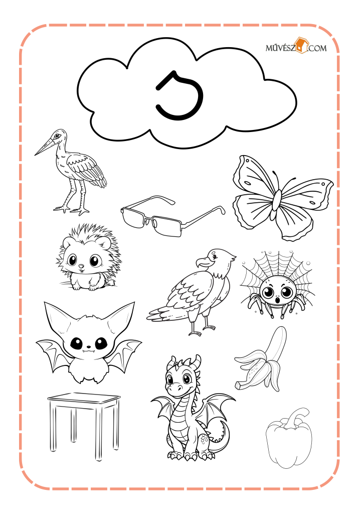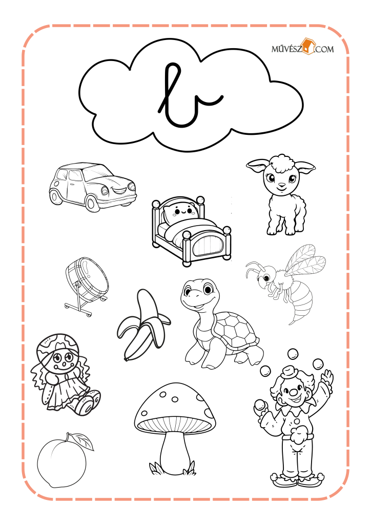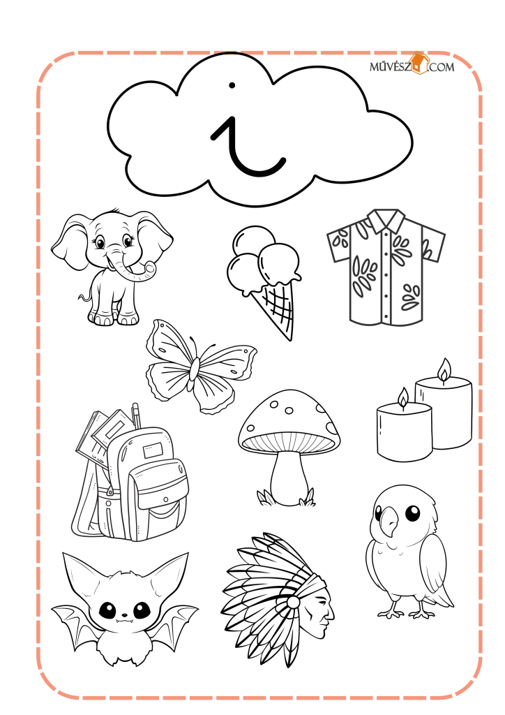 A lap tetején egy felhőben látható egy írott kisbetű. Gyermeked feladata, hogy színezze ki azokat a képeket, amelyek neve ezzel a betűvel kezdődik.