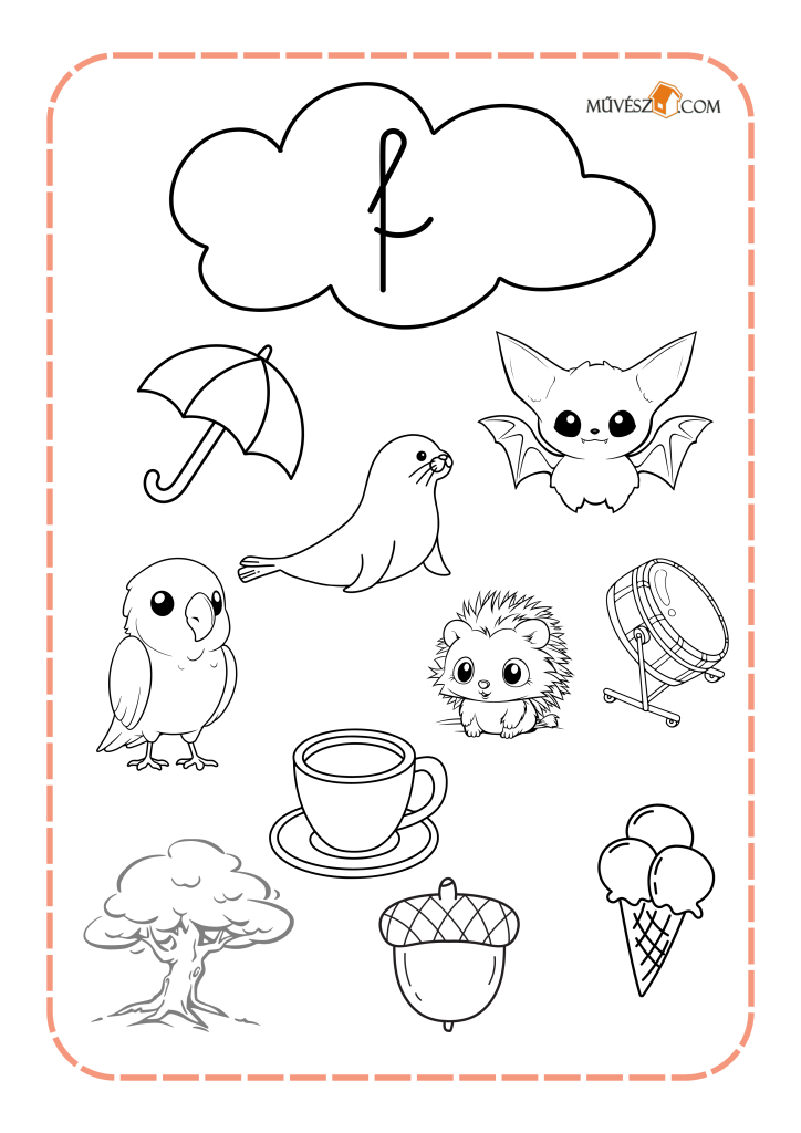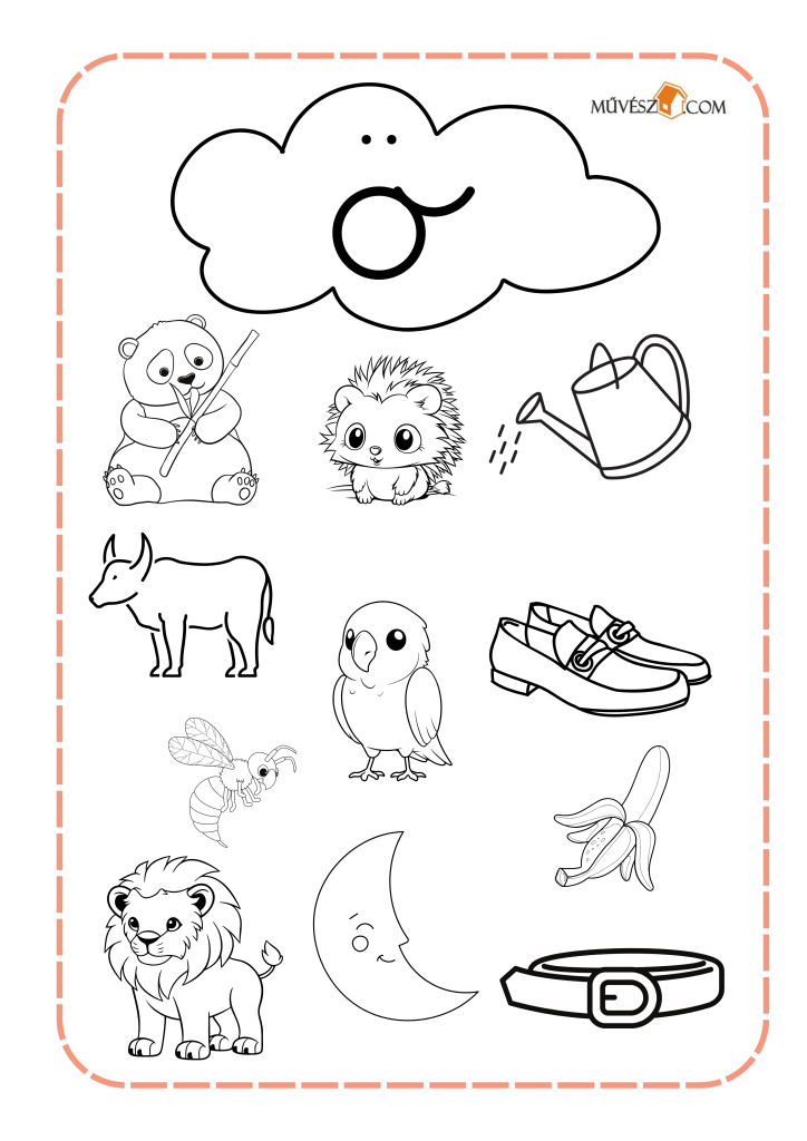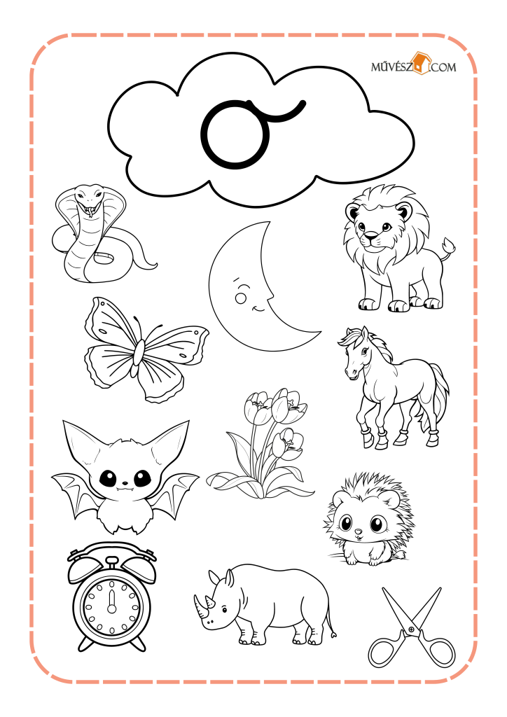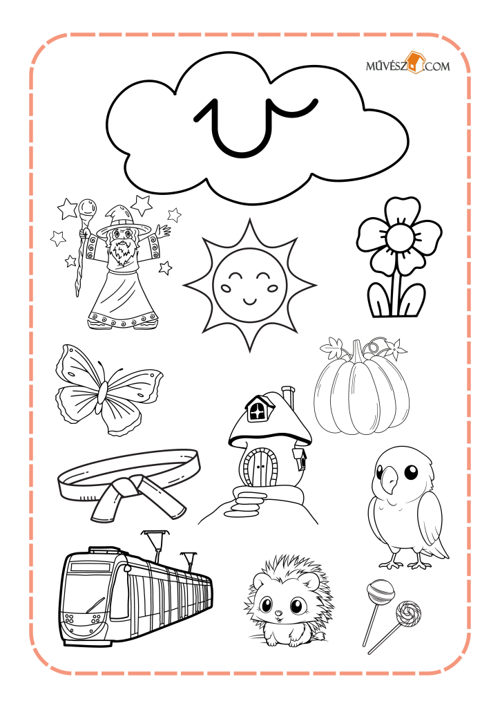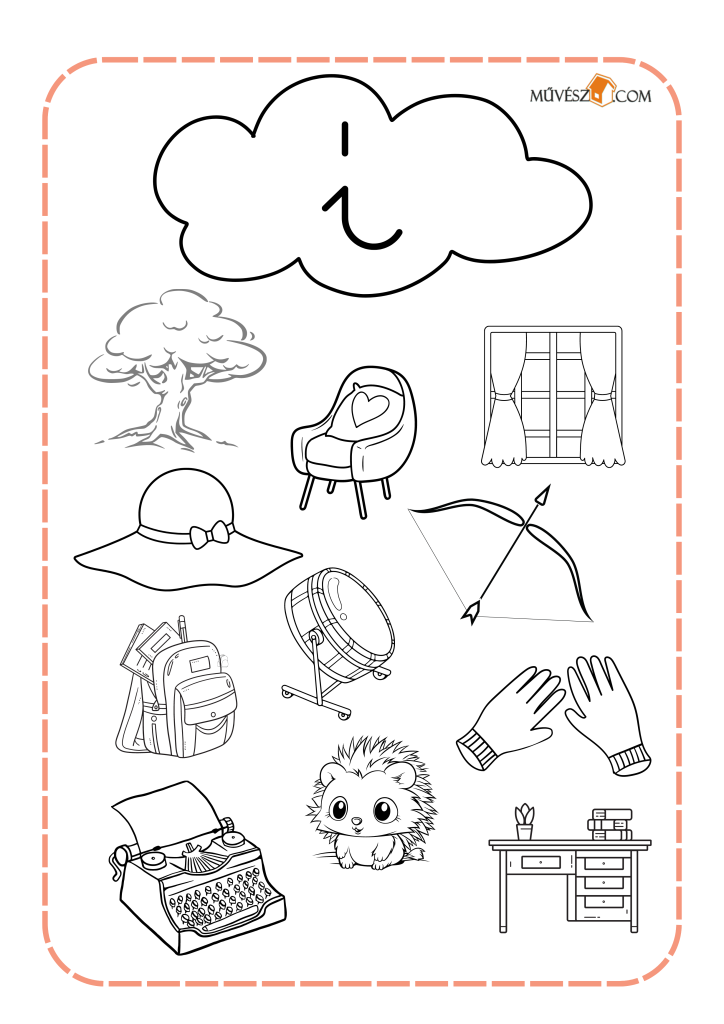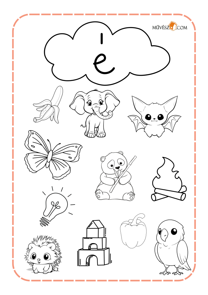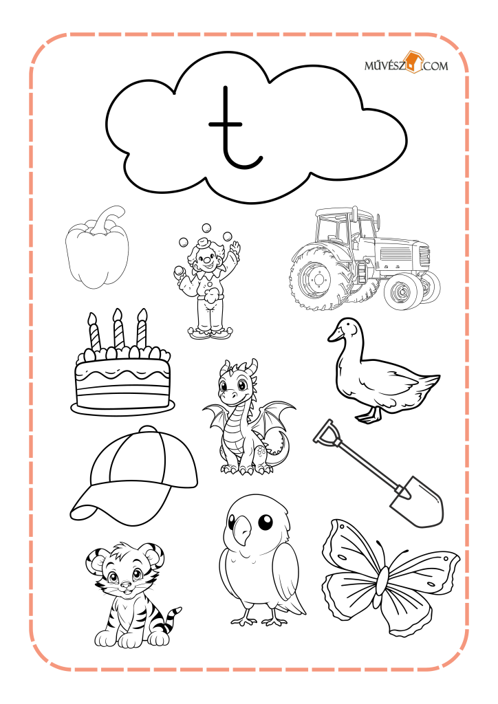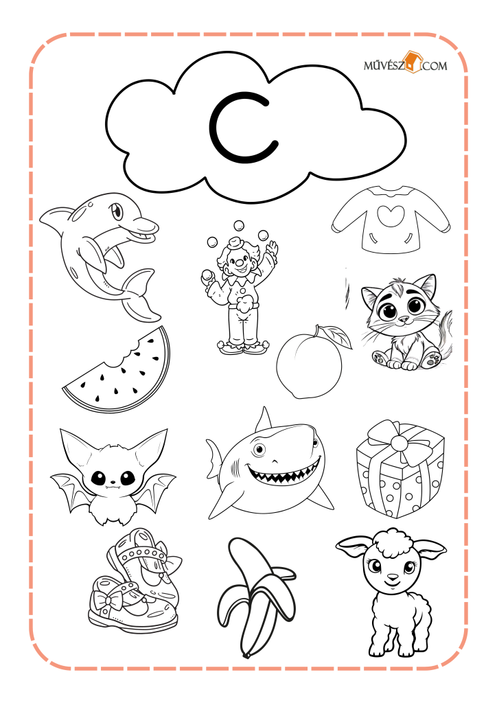 A lap tetején egy felhőben látható egy írott kisbetű. Gyermeked feladata, hogy színezze ki azokat a képeket, amelyek neve ezzel a betűvel kezdődik.