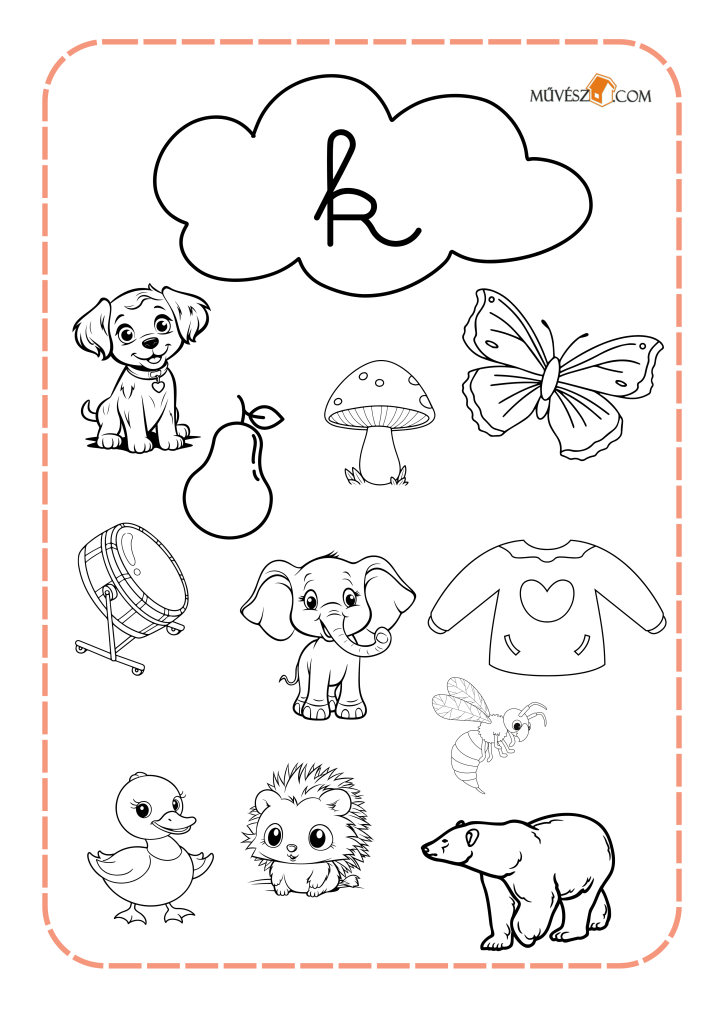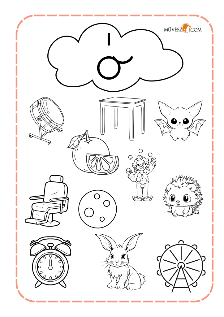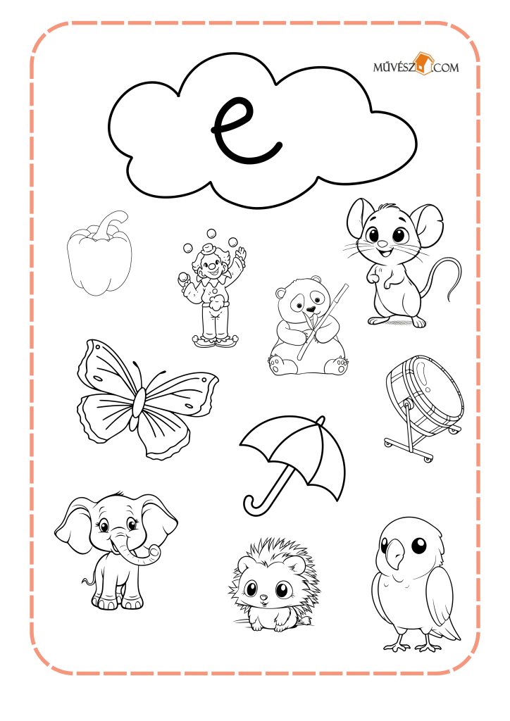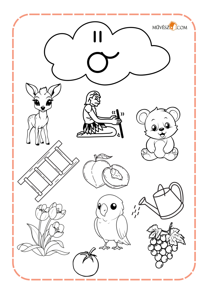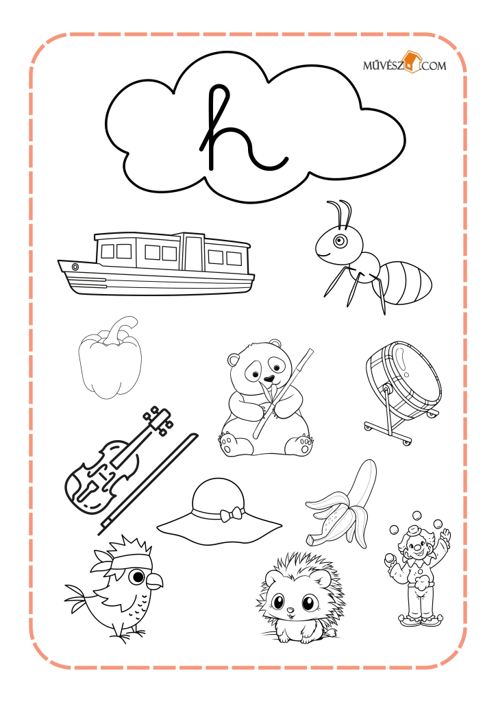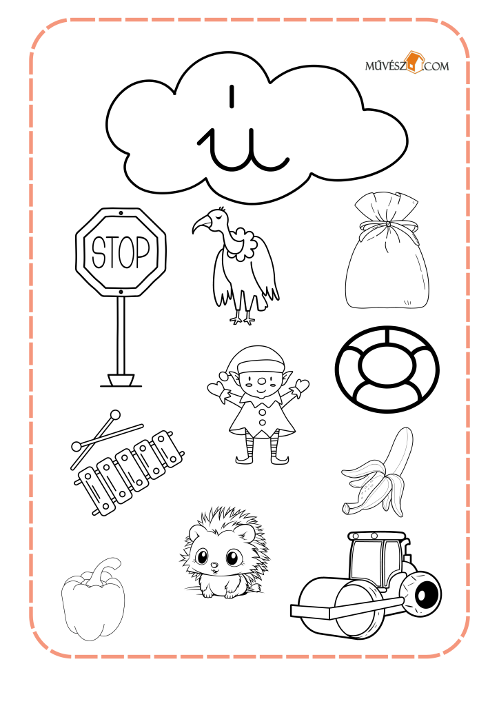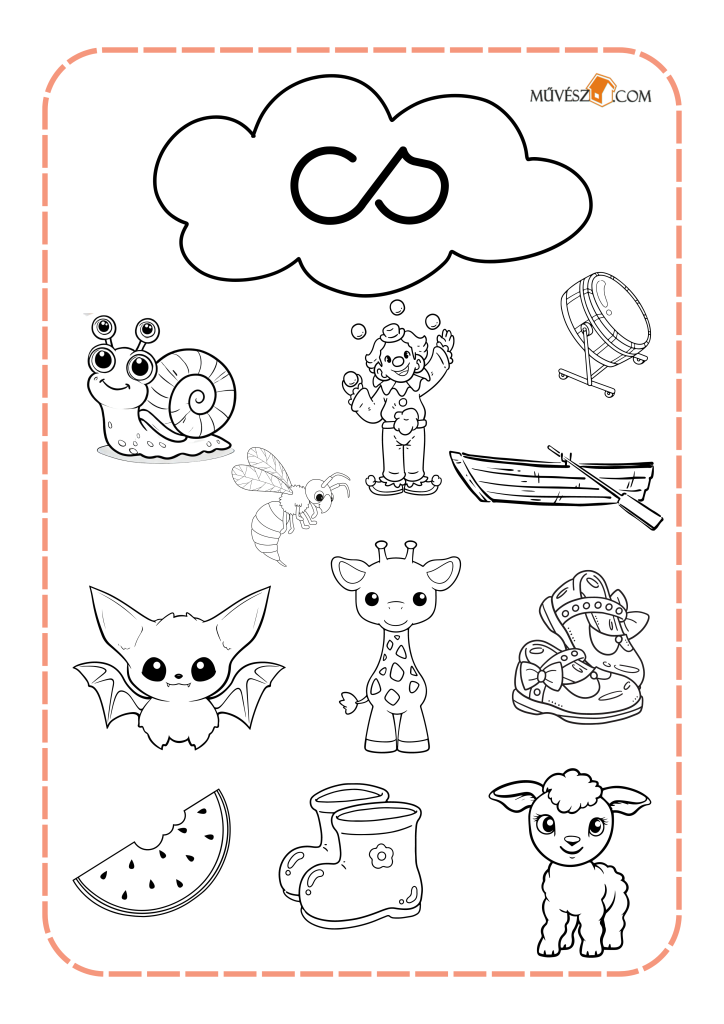 A lap tetején egy felhőben látható egy írott kisbetű. Gyermeked feladata, hogy színezze ki azokat a képeket, amelyek neve ezzel a betűvel kezdődik.