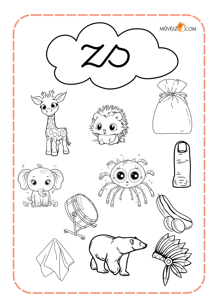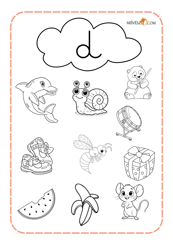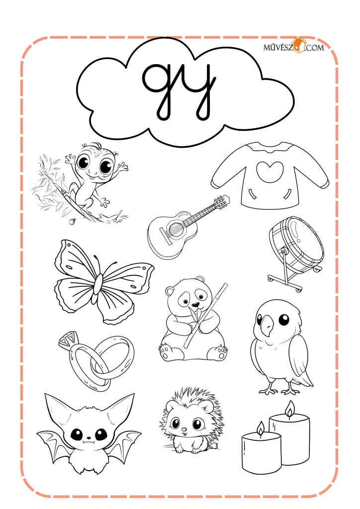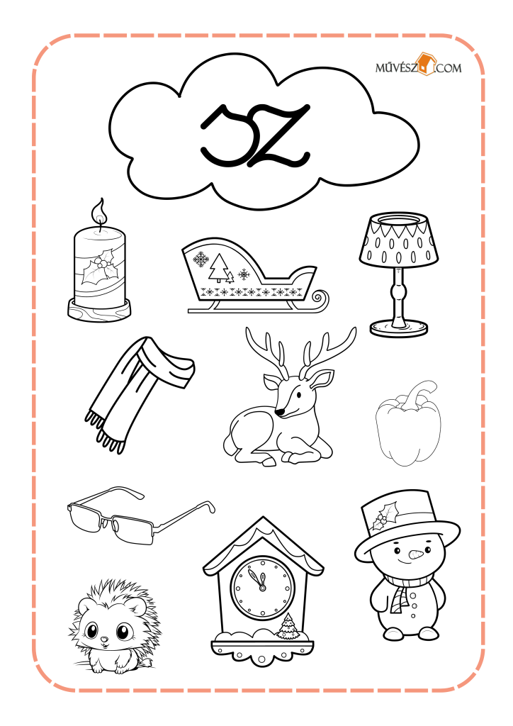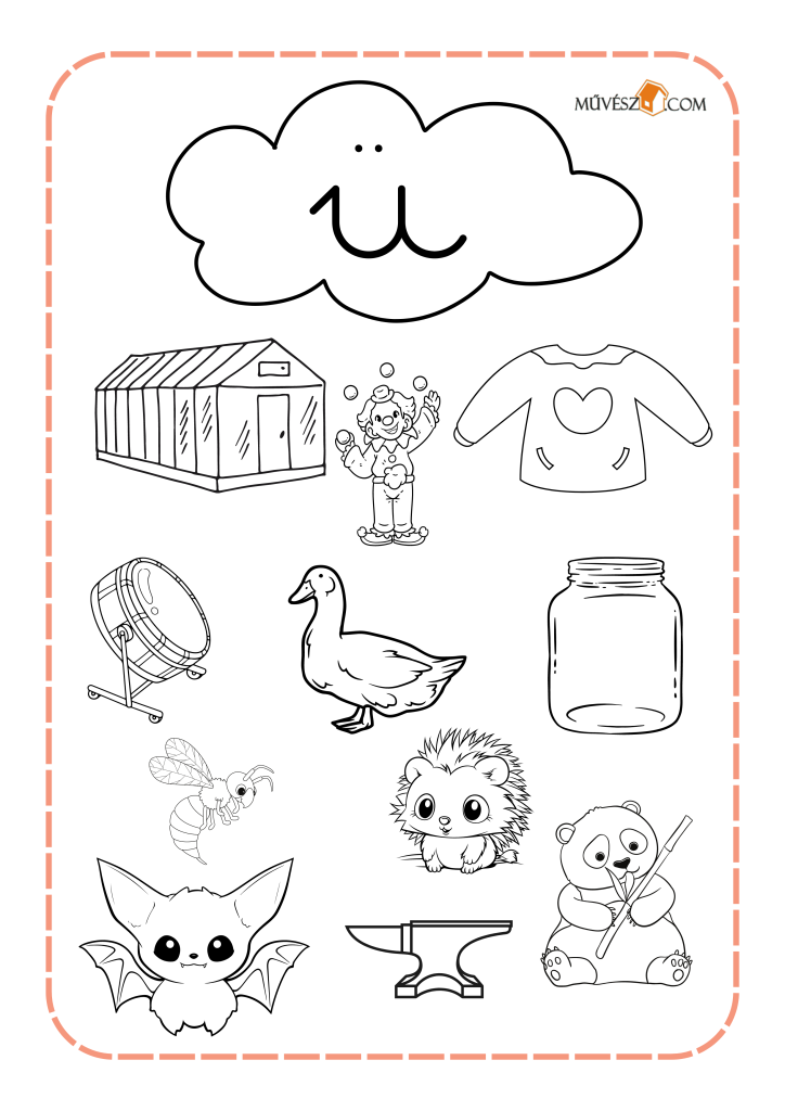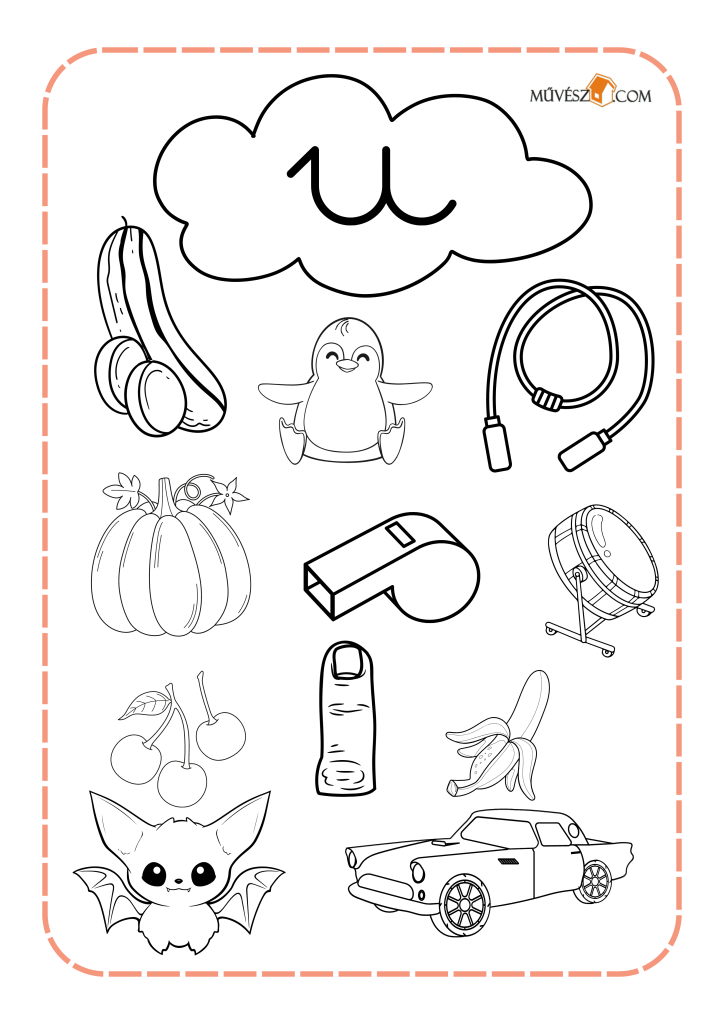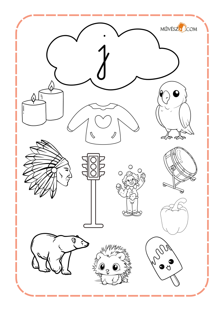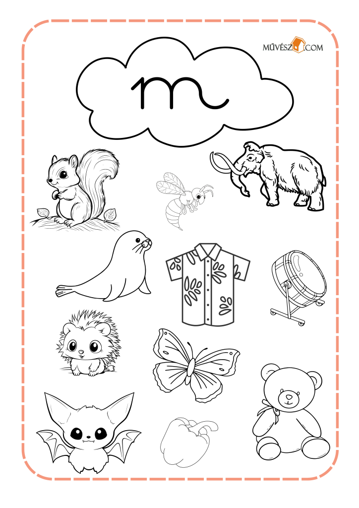 A lap tetején egy felhőben látható egy írott kisbetű. Gyermeked feladata, hogy színezze ki azokat a képeket, amelyek neve ezzel a betűvel kezdődik.