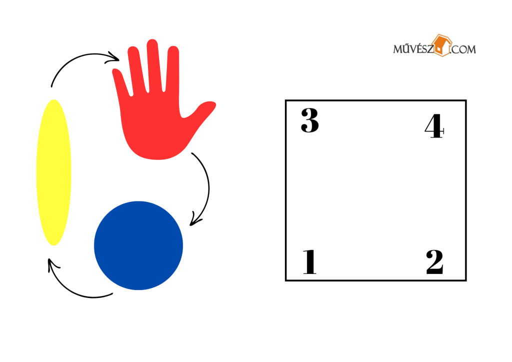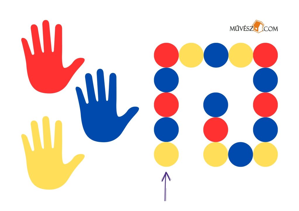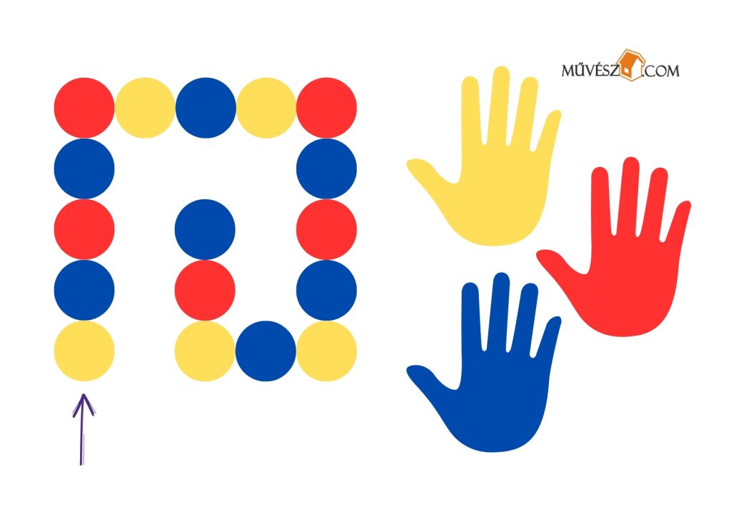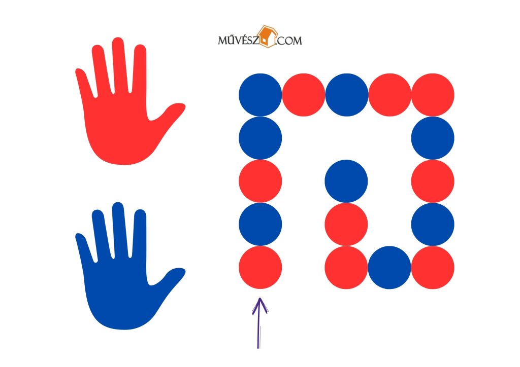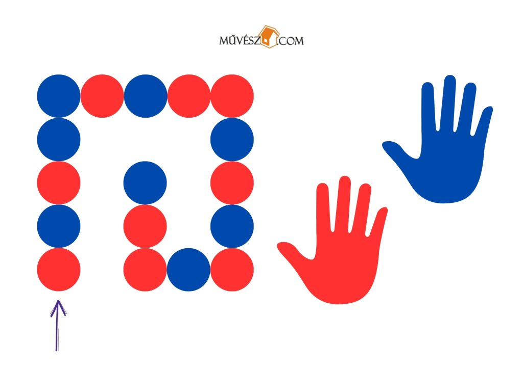 A lenti feladatnál a jobb mutatóujjával érintse végig meg a különböző szinű köröket egymás után! Amikor piros körhöz ér, akkor a bal kezével a piros tenyérre “csapjon”! Ha kék kört érint a jobb mutatóujjával, akkor viszont a kék tenyérre “csapjon”!