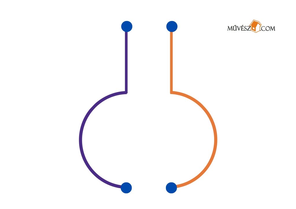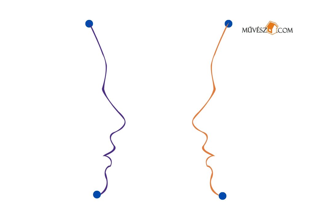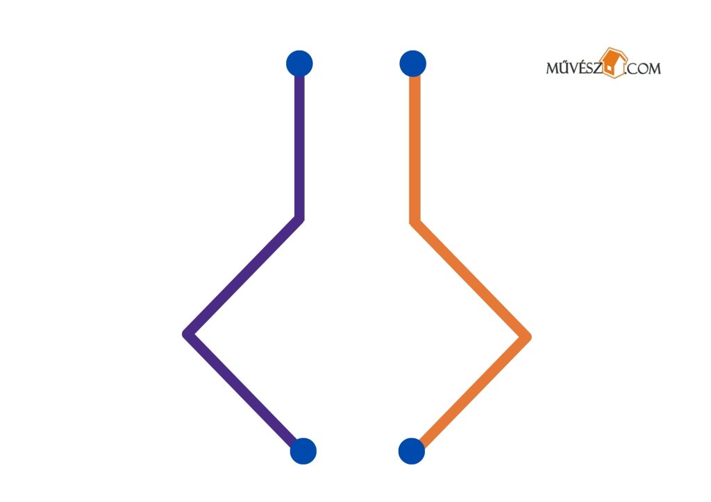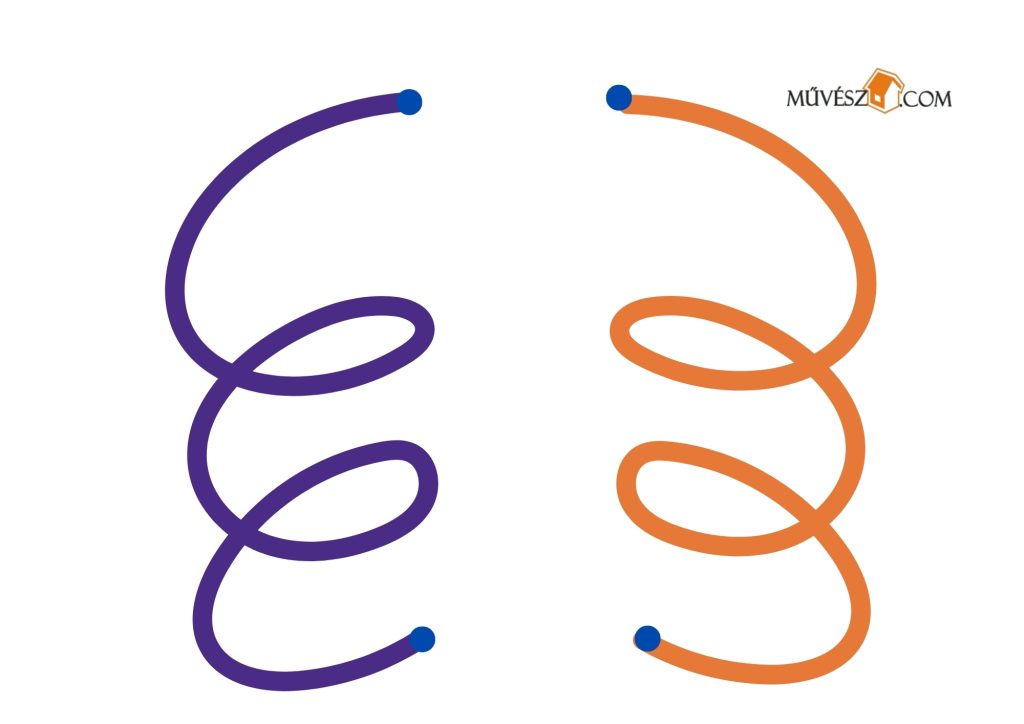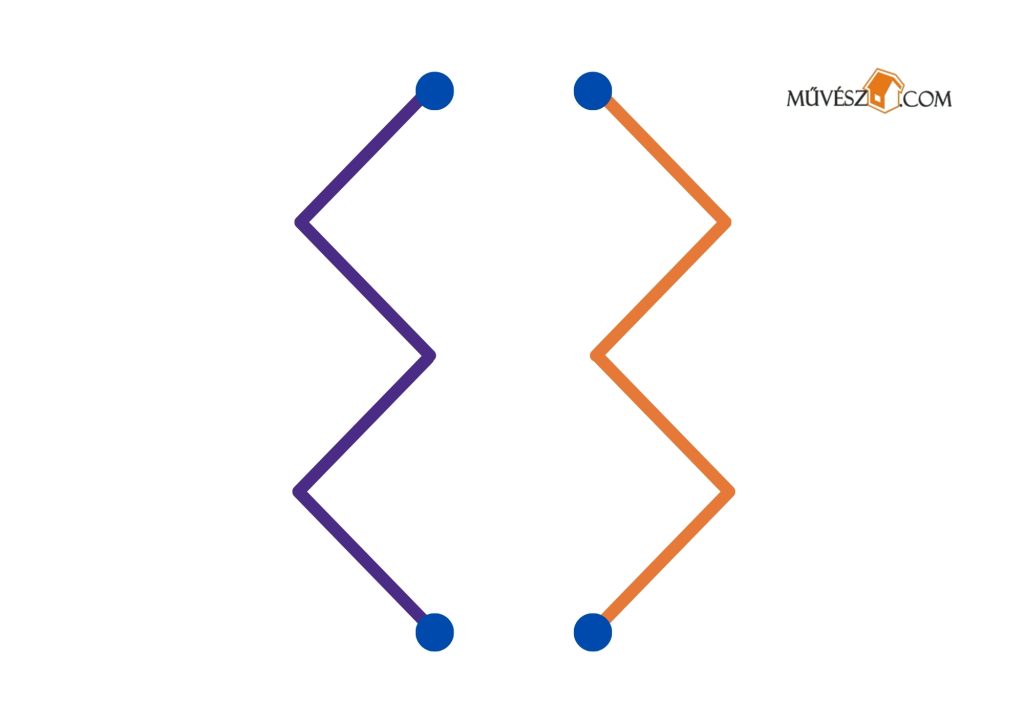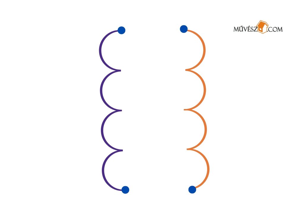 Ez egy kicsit nehezebb feladat, de érdemes megpróbálkozni fele. Szintén mindkét kezében ceruzákat/filceket tartva rajzolja át egyszerre a két vonalat!